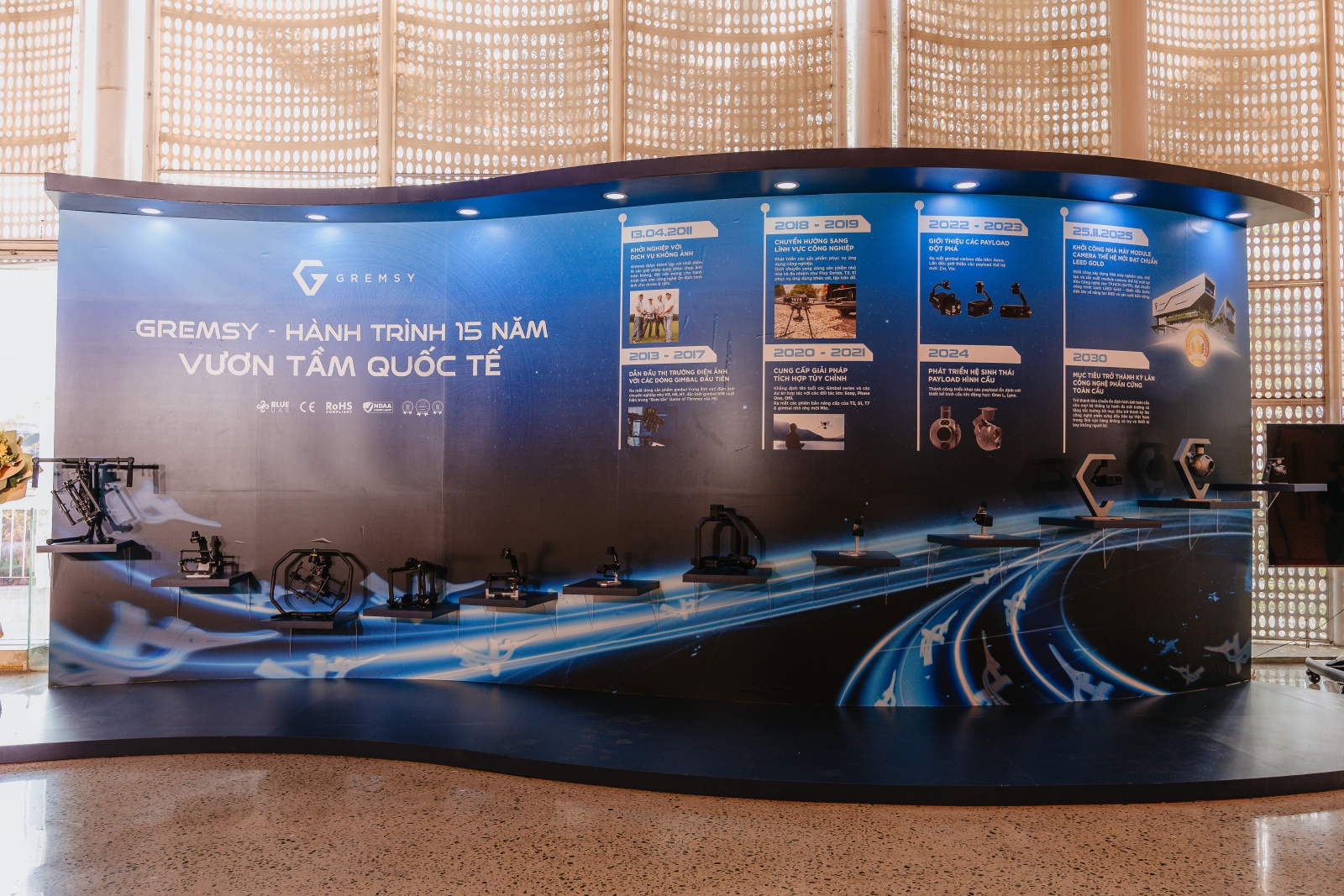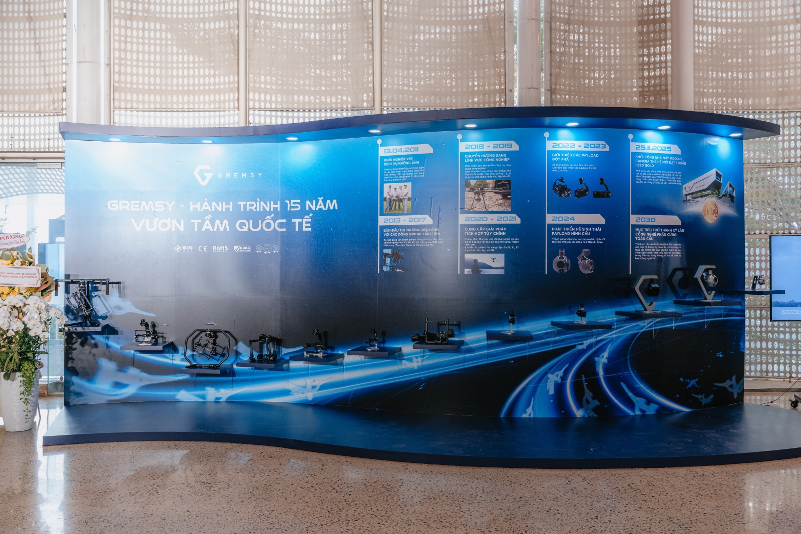 Một điểm đặc biệt của lễ kỷ niệm 15 năm Gremsy chính là khu vực trưng bày sản phẩm. Không chỉ là nơi giới thiệu công nghệ, không gian này giống như một “bảo tàng thu nhỏ” về hành trình phát triển của thương hiệu.
